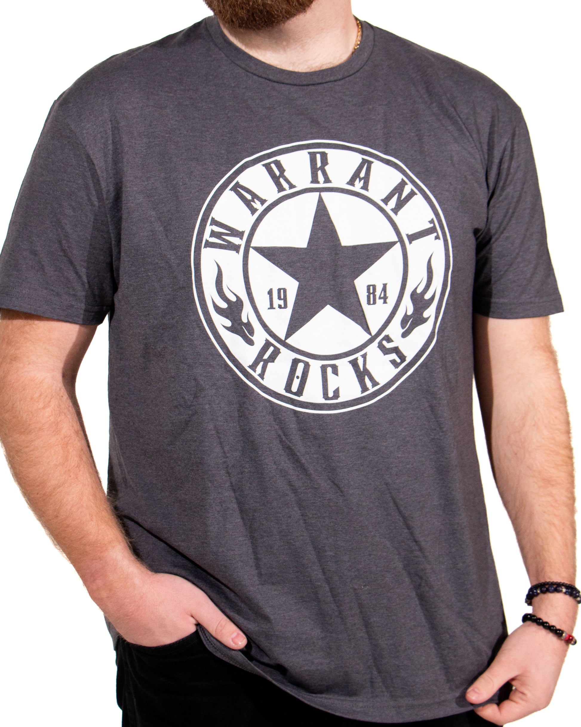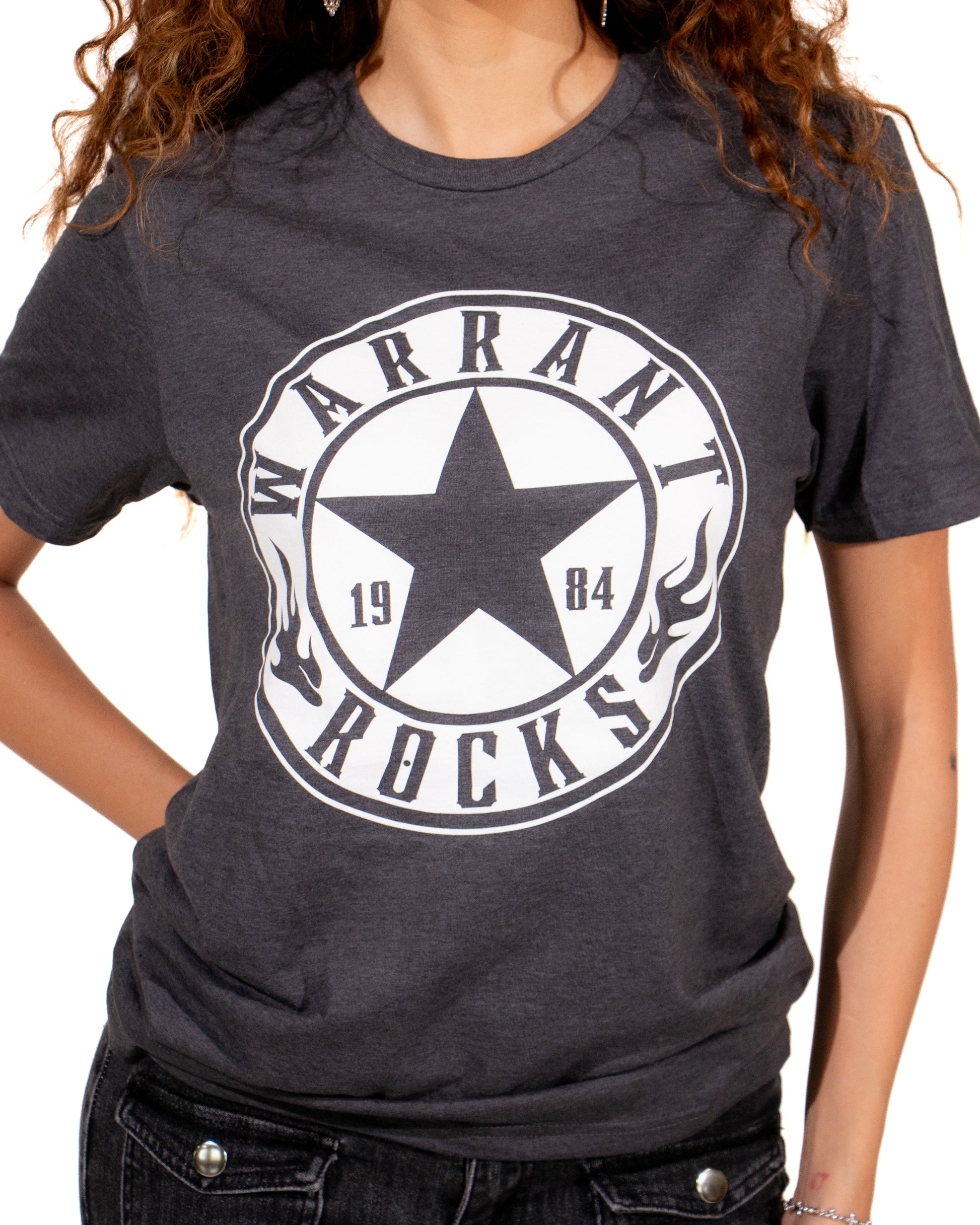 Since ‘84, Warrant has brought the heat—and this design proves it. The blazing black star and bold band logo stamp your loyalty in fire.